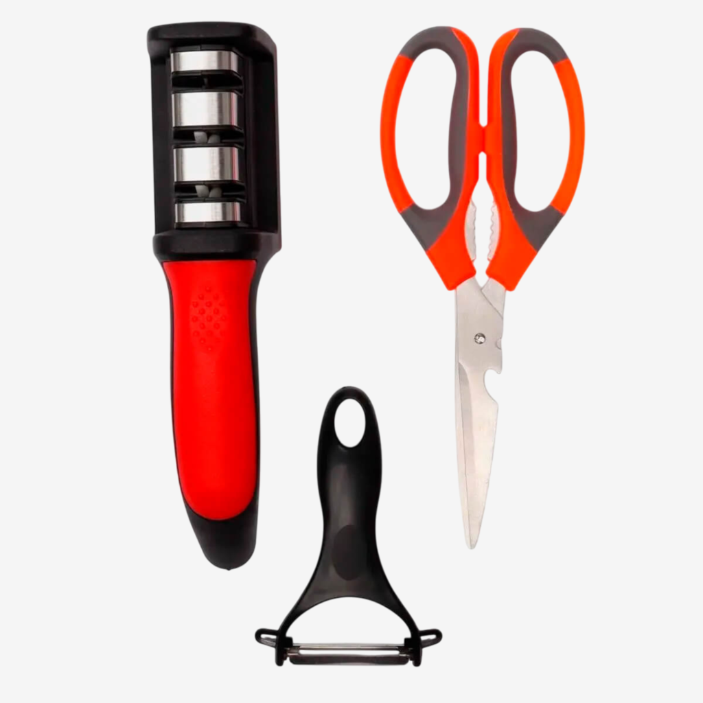 Um trio que salva qualquer cozinha! Esse kit com afiador de facas 3 em 1, tesoura multiuso e descascador ergonômico é daqueles que você não sabe como viveu sem. O afiador tem três estágios (afiar, amolar e dar acabamento) e ainda vem com um abre-garrafa integrado. A tesoura é firme, resistente e pronta pra tudo – da cozinha ao improviso do churrasco. E o descascador? Leve e afiado na medida. Tudo feito com materiais duráveis como inox, cerâmica e ABS. Ideal pra facilitar a rotina, seja em casa, no restaurante ou até no camping.